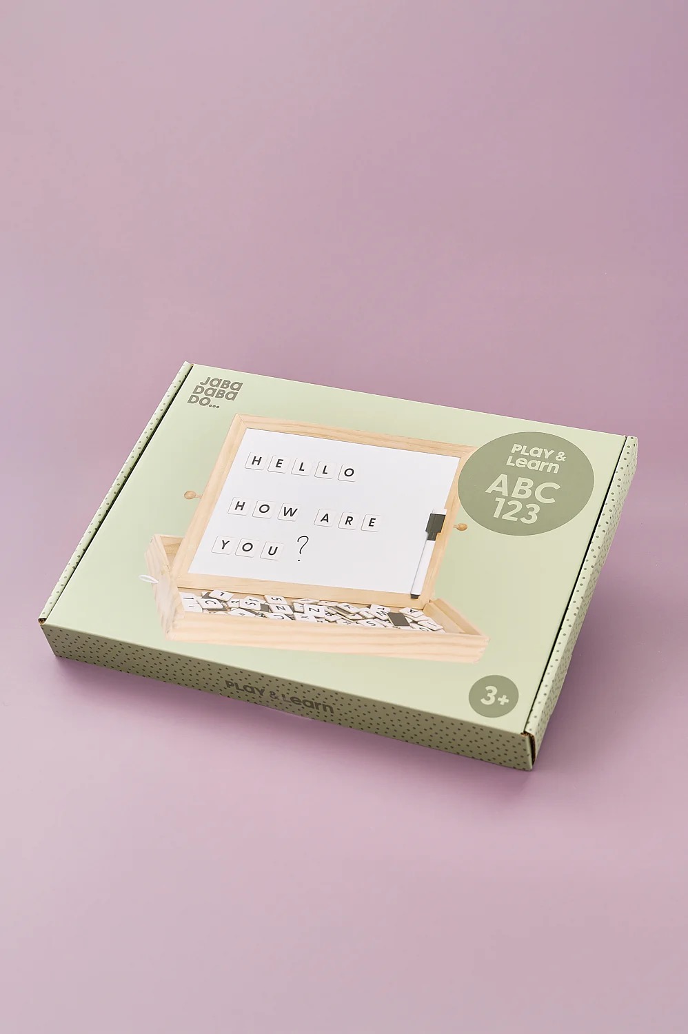 En pedagogisk och lekfull leksak som hjälper barn att lära sig bokstäver och siffror på ett roligt sätt. Setet innehåller en whiteboard med penna samt lösa brickor med bokstäver, siffror och specialtecken, inklusive skandinaviska och tyska tecken. Allt förvaras i en hållbar trälåda som även fungerar som skrivyta. Play and Learn Letters & Numbers